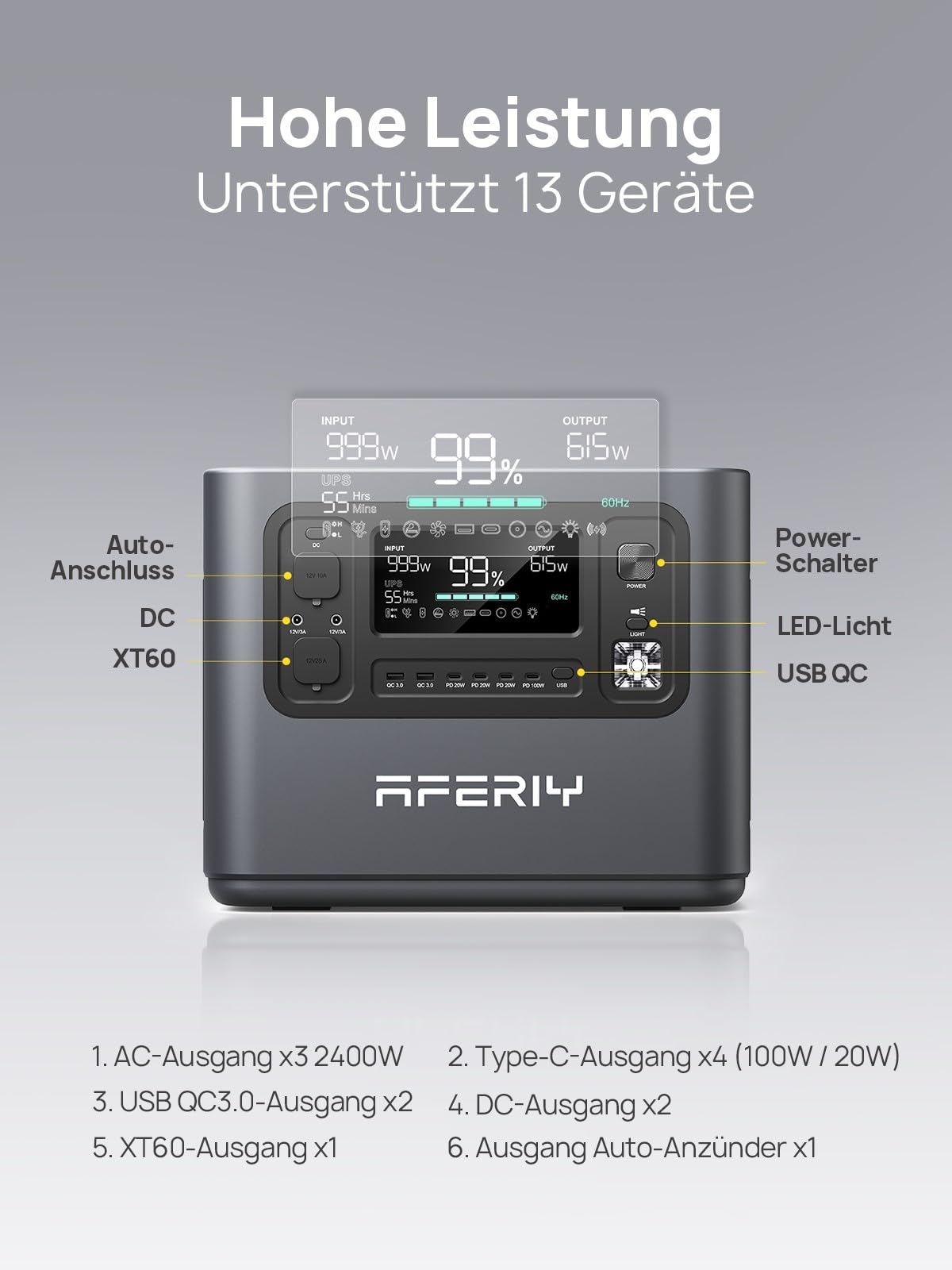 AFERIY 2400W Tragbare Powerstation, 2048Wh LiFePO4 Batterie, 1,7 Stunde Schnellladung, 13 Anschlüsse, Sinuswellen 230V, USV, Mobile Stromversorgung für Outdoors Camping, 7 Jahre Garantie