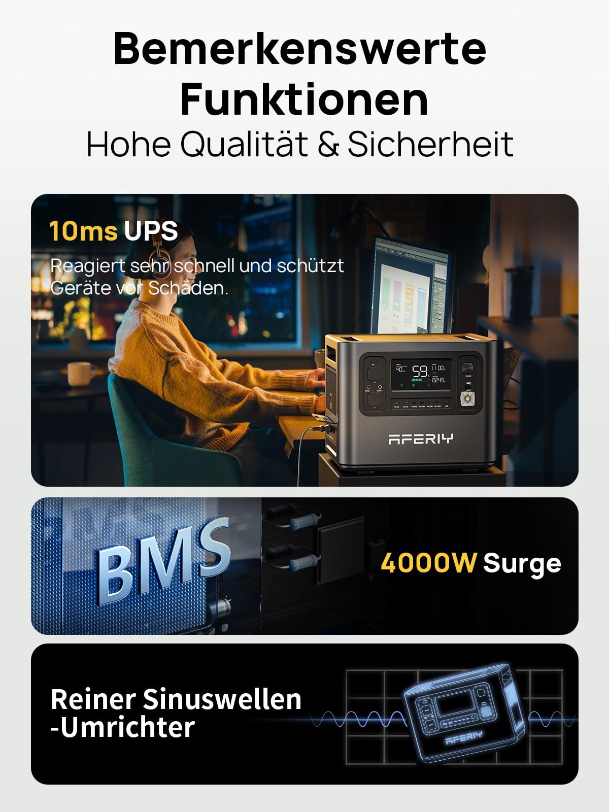 • 【UPS Funktion】Die tragbare Stromstation schützt Ihren Desktop-PC, indem sie das Produkt zwischen Steckdose und Gerät verbindet. Bei einem plötzlichen Stromausfall/Spannungsabfall schaltet der AFERIY-Notstromgenerator innerhalb von 10 ms automatisch auf USV-Stromversorgung um, um den normalen Betrieb des Geräts zu gewährleisten und Ausfallzeiten der Geräte zu vermeiden, um die wertvollen Daten auf Laptops, Festplatten und Servern zu schützen.