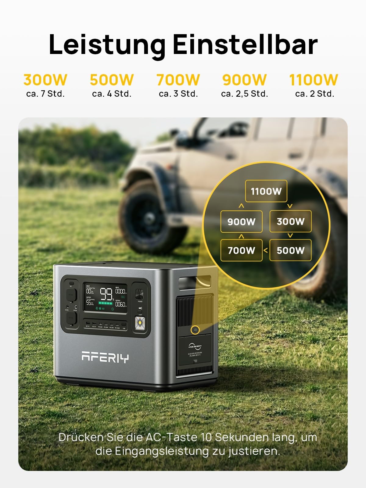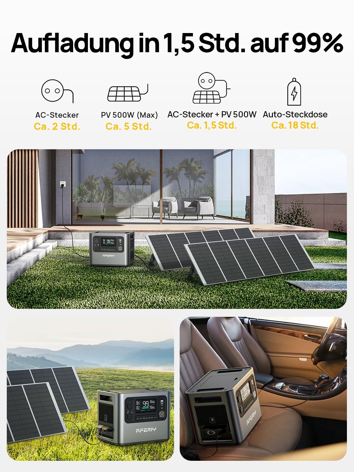 • 【Ultraschnelles Laden 】Die exklusive Technologie der AFERIY-Solarstation kann die doppelte AC + Solarpanel-Ladung in nur 1,7 Stunde durchführen und verfügt über eine Durchgangsfunktion ohne Ladewartezeit. Darüber hinaus dauert es nur 2 Stunden, Verwenden Sie die 1100W-Schnellsteckdose, um sich zu 100 % aufzuladen. Solargenerator mit integriertem MPPT-Regler, unterstützt bis zu 500 W MC4-XT90 cable solar input.