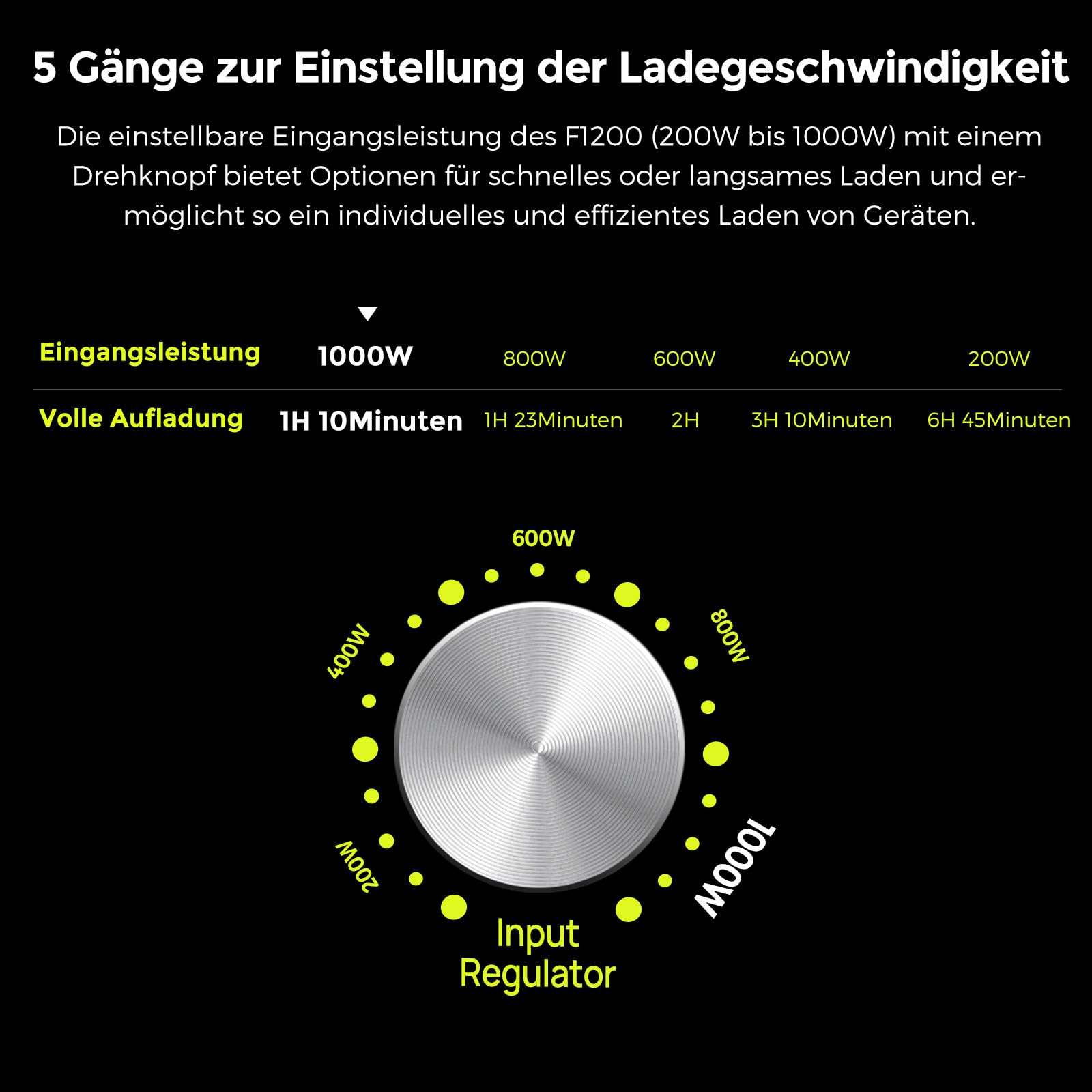 - [5 Stufen der Ladegeschwindigkeit] Die über einen Drehknopf einstellbare Eingangsleistung des F1200 (200W bis 1000W) ermöglicht schnelle oder langsame Ladevorgänge und bietet ein individuelles und effizientes Ladeerlebnis.