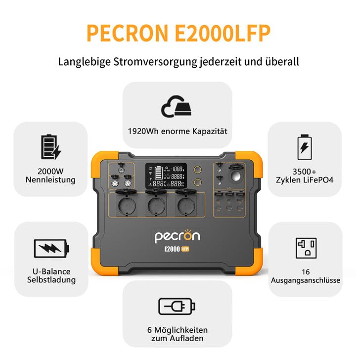 pecron Tragbare Powerstation E2000LFP,1920Wh LiFeP04-Batterie mit 2000W AC Ausgängen Stromgenerator für Reise/Camping/Outdoors/Emergency