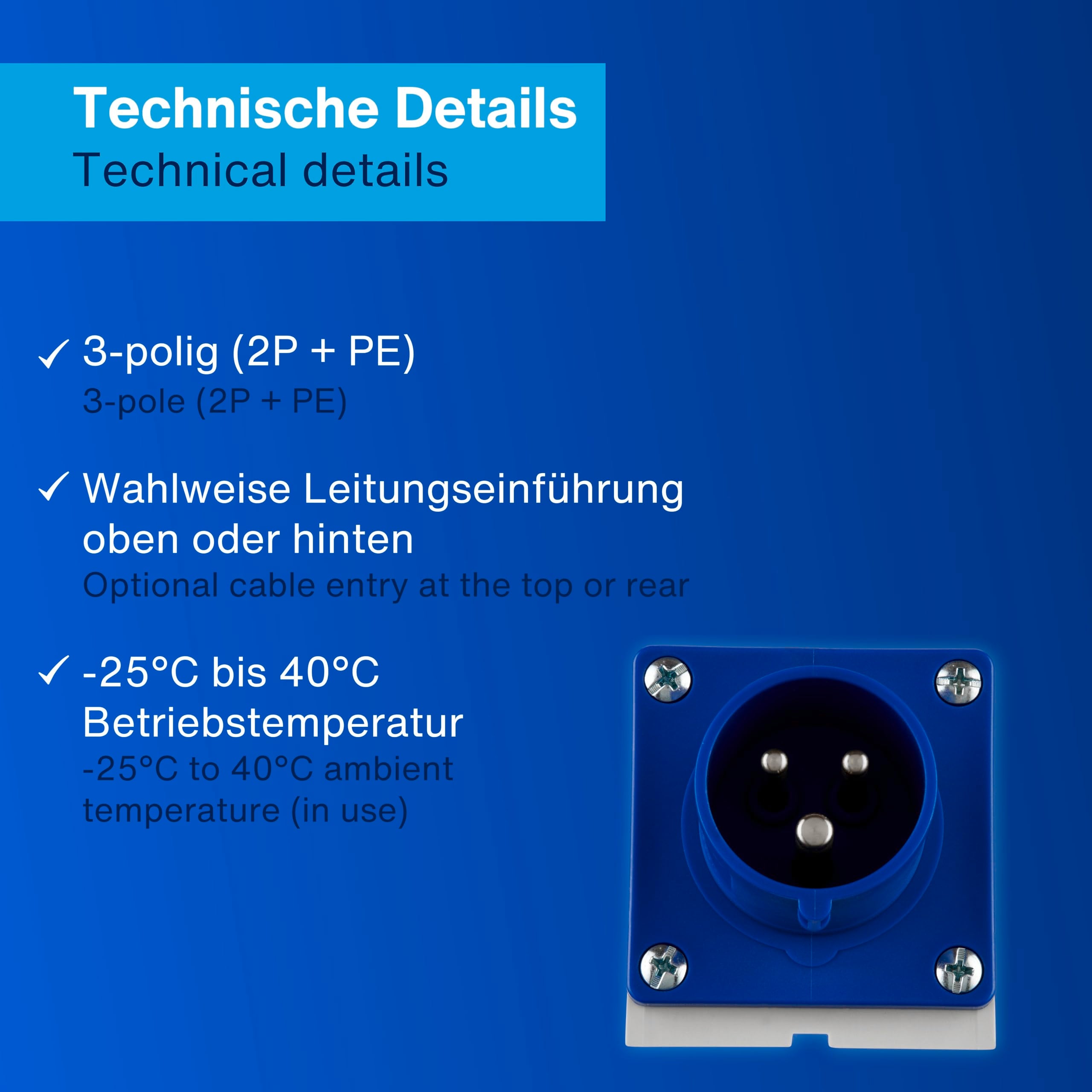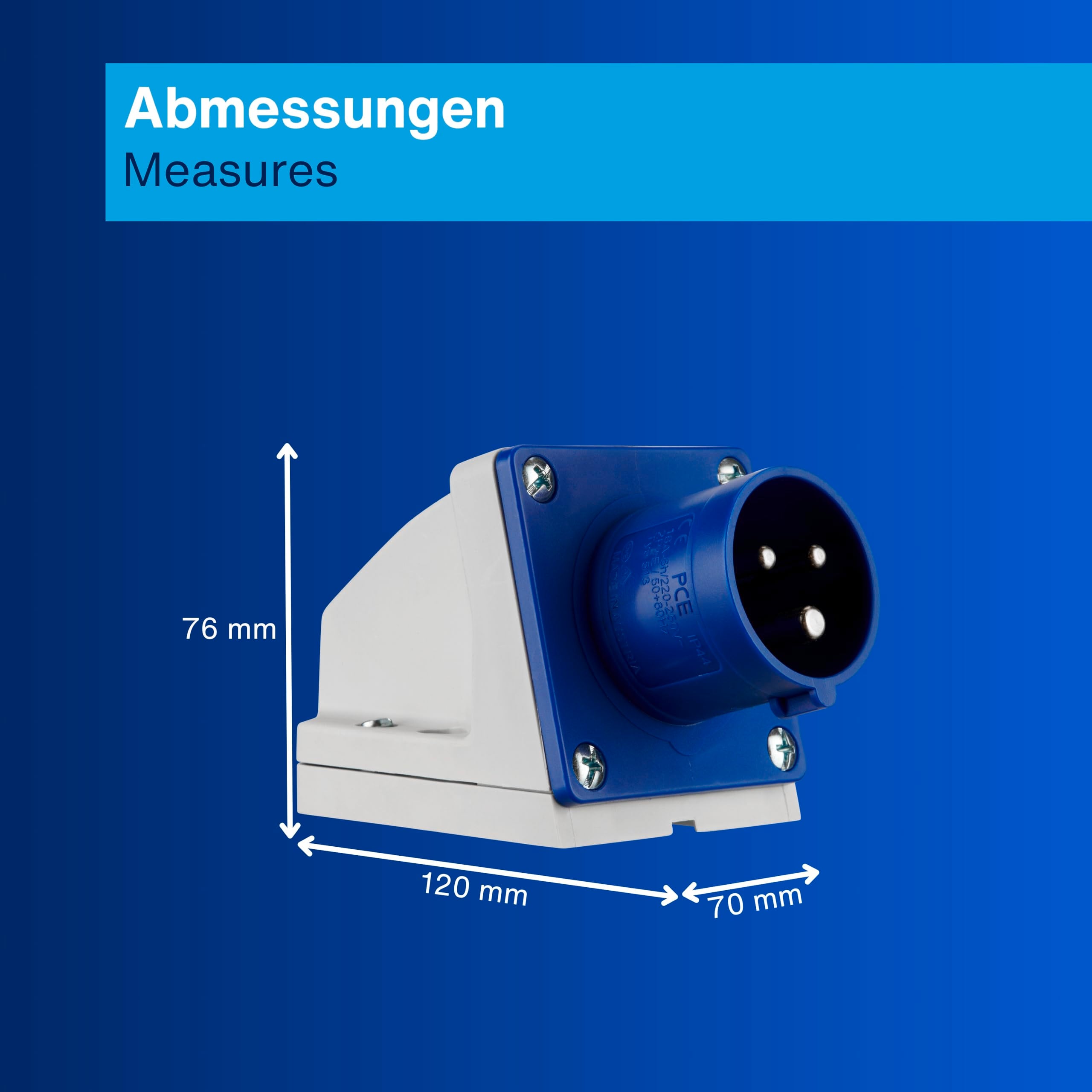• Technische Details des CEE Steckers für Wandmontage: 230V~, 50Hz, 16A. Abmessungen (HxBxT): 76 x 70 x 120 mm, Gewicht: 174g, Farbe: blau