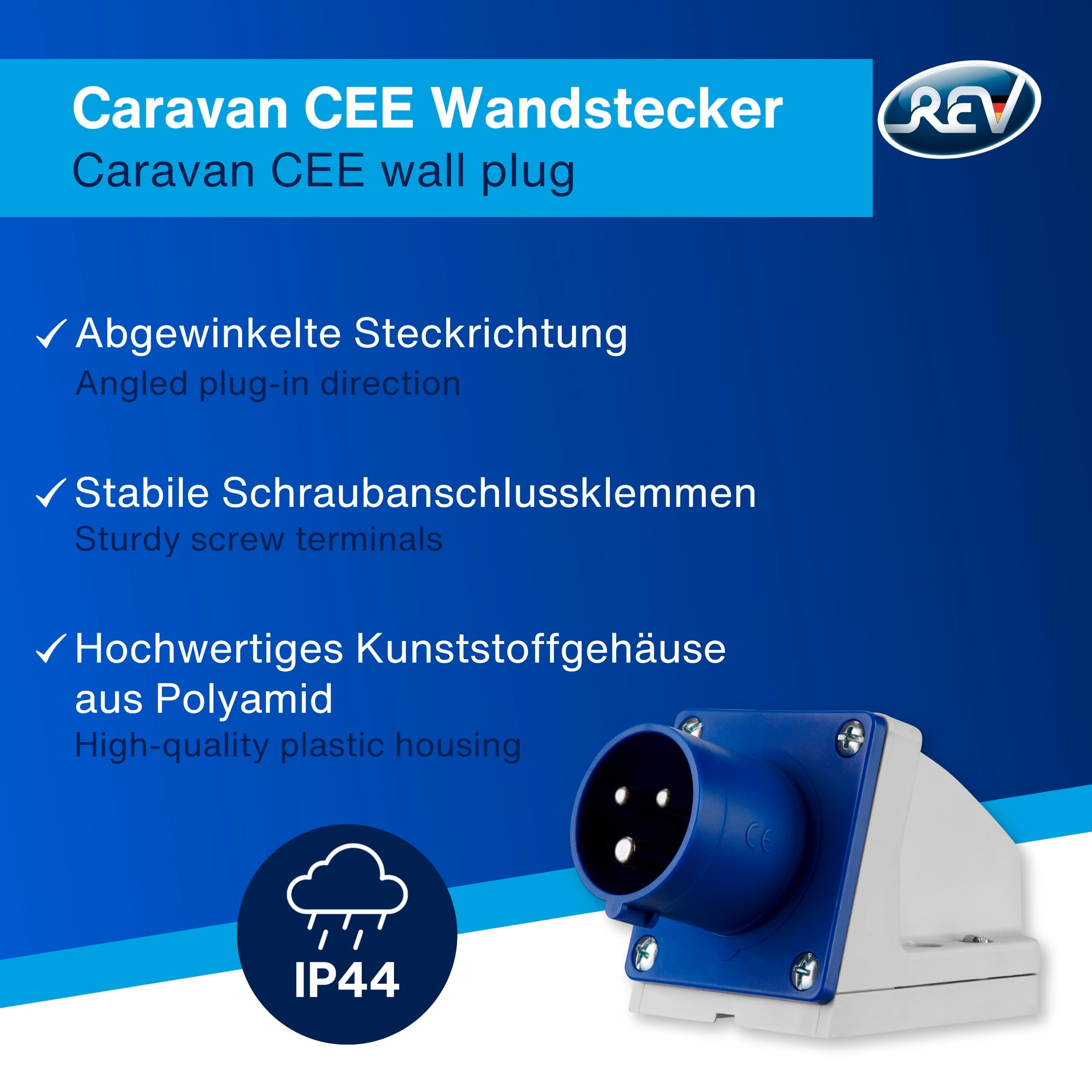 REV Caravan, CEE-Stecker Wand 230V, 3-polig, 1Ph + N+ PE, IP44, blau